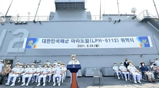 6月29日,韩国一艘准航母——“马罗岛”号两栖攻击舰下海服役。这可是国之重器,不过,在庆祝仪式的横幅上,清晰写着两个大大的汉字:“庆祝”。
