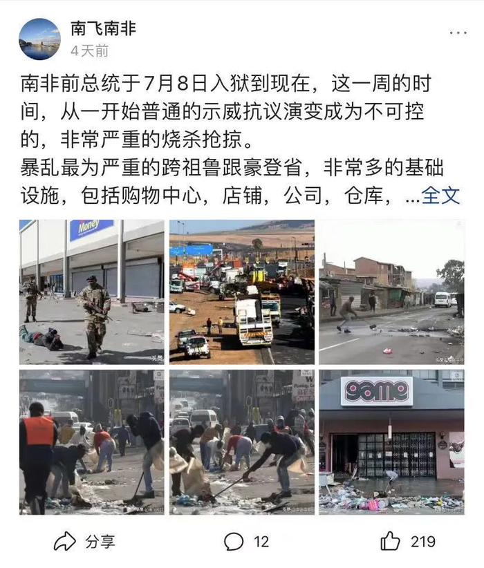 7月12日一早,当地华人王敏(化名,@头条昵称“南飞南非”)开车穿过约翰内斯堡黑人聚集区亚历山大区去上班。她透过车窗看到:经过一夜暴乱,商铺被洗劫一空,浓烟四起,仍有很多暴徒在街边聚集。