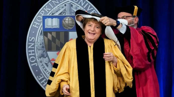 之后默克尔被约翰霍普金斯大学授予荣誉学位。不过这对默克尔来说根本不算啥,因为这是她第18个荣誉学位了。