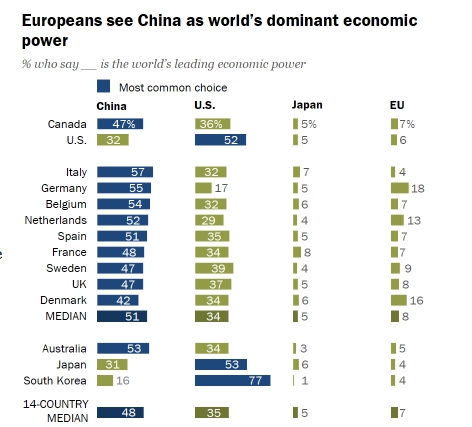 皮尤民调去年的数据显示,55%的德国人认为,中国已经超越美国成为世界领先的经济强国。《世界报》在去年12月的一份民调显示,只有17%的德国人支持在潜在中美冲突中,站到美国一边,四分之三的人更愿意保持中立。