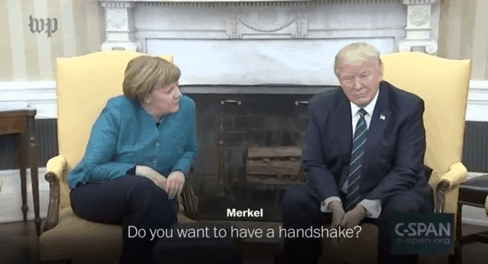 2017年默克尔访问白宫时,又一个历史性名面场来了。在椭圆形办公室会晤结束后,默克尔试图与特朗普握手,但是对方完全沉浸在自己的世界中。