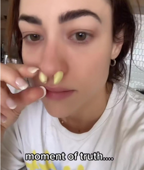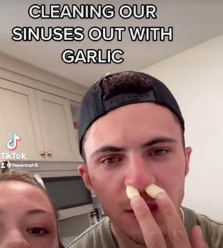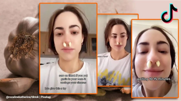 亚利桑那一位患有鼻窦炎的小网红Rozaline Katherine将这一招式推上了热搜。起先她对这一祖传偏方不置可否,出于实验的态度,她决定拍摄一段反应视频。她以搞笑的目的记录这一切,将两个蒜瓣去皮塞进鼻孔,放置十分钟静观其变。