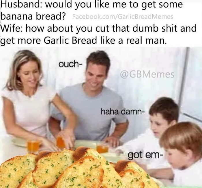 老公:需要我去买点香蕉面包吗?老婆:你不如把那玩意儿切了,然后像个真男人一样来点大蒜面包