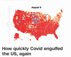 如今有大约98.2%的美国人口,都居住在新冠病毒传播率为“高”水平或“大量”水平的县,而这一比例,在一个月前还只有19%。