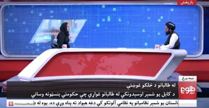 8月17日,塔利班高级将领哈马德在喀布尔接受一名阿富汗电视台女记者的电视专访