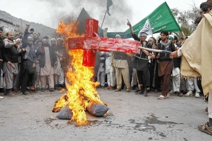2012年3月,阿富汗喀布尔,一群极端宗教分子焚烧十字架和基督教标志