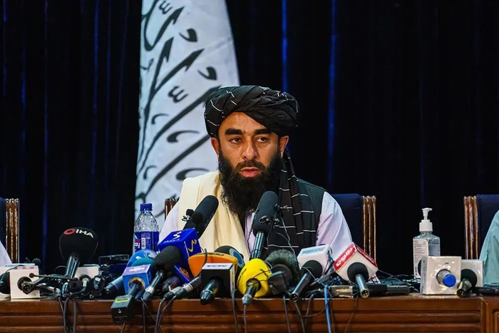 8月17日,阿富汗喀布尔,新闻发布会现场,塔利班发言人扎比乌拉·穆贾希德(图源:人民视觉)