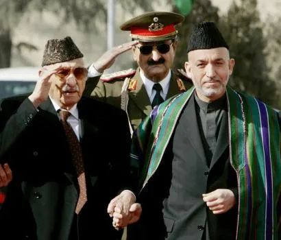 阿富汗末代国王查希尔(左)与选为阿富汗伊斯兰共和国首任总统哈米德·卡尔扎伊共同出现在后者的就职典礼上