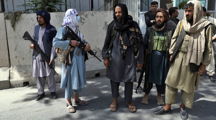 8月16日,阿富汗总统府外站岗的塔利班成员