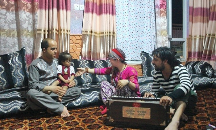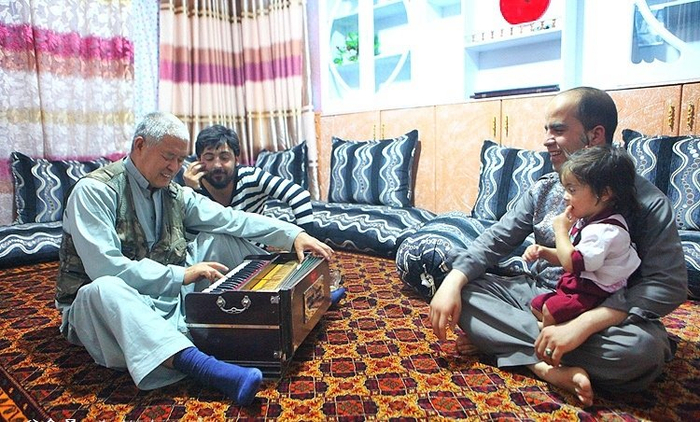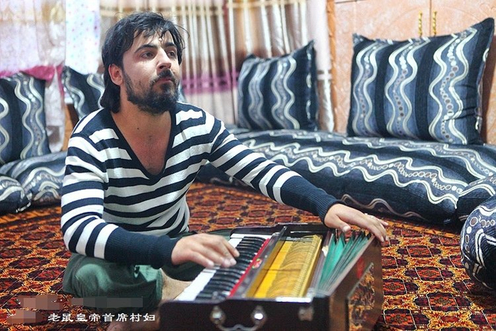 请注意:皇帝玩琴时,两个阿富汗男人都假装听得入神。轮到村妇弹奏,其中一个就不由自主凑了过来。