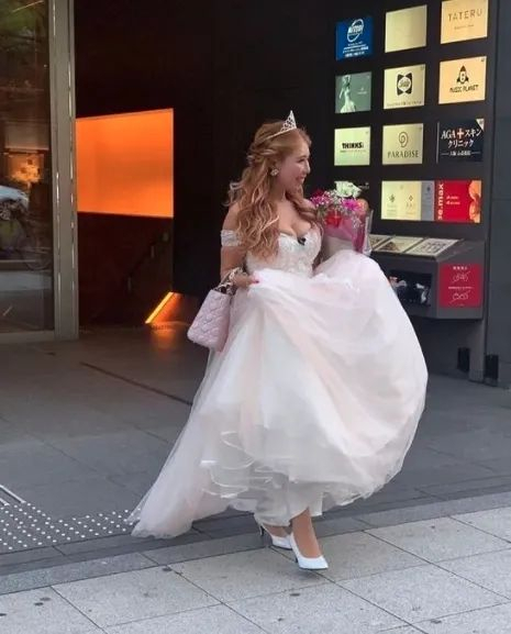 41岁的桥本Sari桥本Sari的出场充满了公主的仪式感,身着一袭乍一看像是婚纱的纯白色拖地长裙,身旁还跟着一位身材瘦长的小鲜肉,专门为她撑伞。