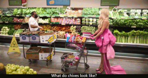 节目里,她无时无刻不延续着自己的招牌粉色drama装扮。逛超市是这样的: