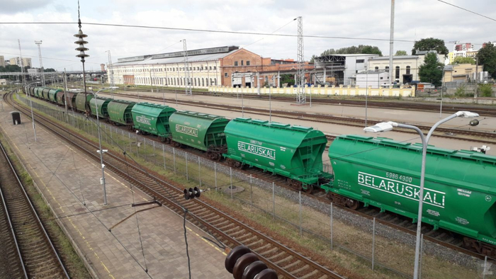 ●在立陶宛首都维尔纽斯郊区临时停靠的“白俄钾肥”货运车厢 / 网络