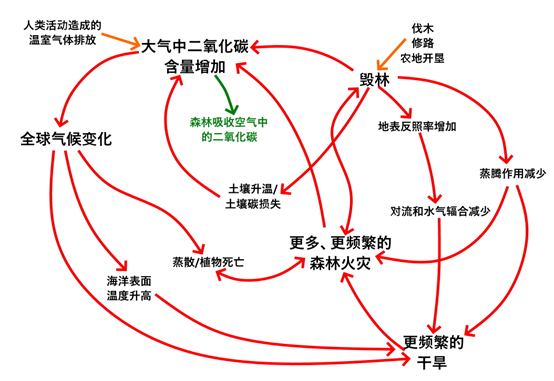 ●亚马孙雨林毁林、干旱、森林火灾与气候变化的相互作用关系,比文中简述的要复杂得多 / 绿色和平翻译,部分改绘
