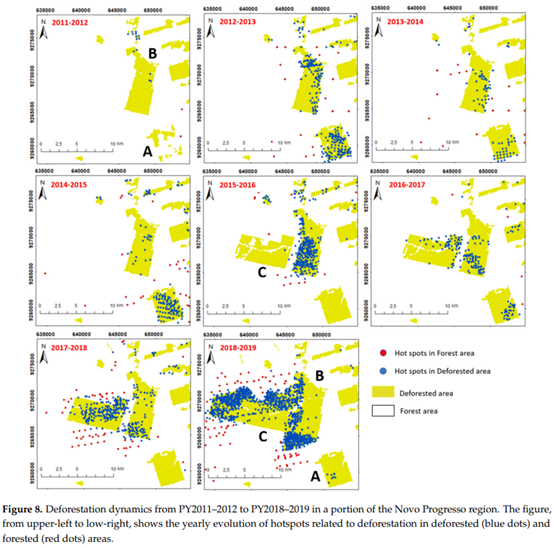 ●Novo Progresso地区毁林地块(黄绿色块)与森林火灾分布的位置关系,蓝点代表火灾发生在毁林地块上,红点发生在毁林地块之外。/ Silva et al。, 2021