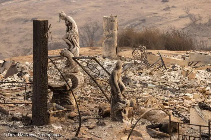 ●2021年8月下旬,美国加州沃福德高地刚刚经历完一场最高预警级别的干旱。伊莎贝拉湖区因野火燃烧了整整一周,过火面积超过当地总面积的19%。图为火灾过后的建筑物残骸。/ 绿色和平美国办公室