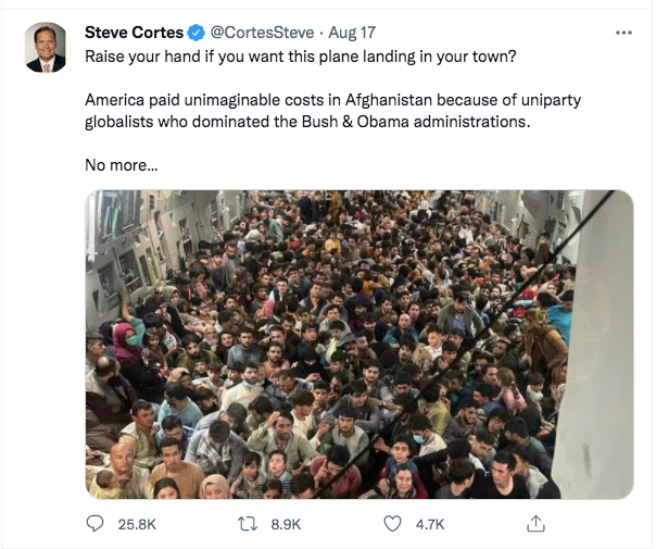 特朗普的前顾问Steve Cortes在推特上发了一张满载难民的飞机,配文是:“如果你想让这架飞机降落在你的城镇,请举手?”