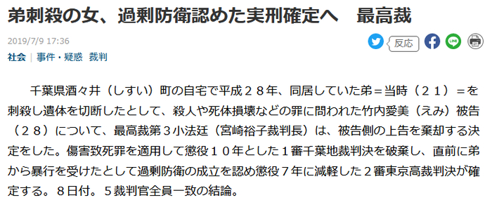 一审判决她存在伤害致人死亡罪行,判处10年有期徒刑。竹内爱美不服上诉,2019年,最高法院认为她存在防卫过当行为,刑期被改为有期徒刑7年。
