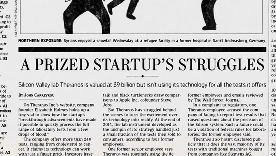 2015年10月15日,《华尔街日报》头版发文:《一家备受赞誉的初创公司的挣扎》(A Prized Startup’s Struggles)。