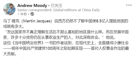“中国在40多年里使8.5亿人摆脱贫困所取得的成就在西方并不被广泛承认。当你观察全球贫困统计数据时,全球进步的很大一部分是由中国推动的。要不是中国,我们离实现联合国所有目标的差距还很远。”
