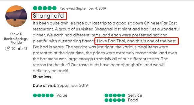 荷兰街头巷尾的中餐厅就没几家是正宗的,这造成认知层面的误区,很多荷兰人习惯把印尼菜叫做中国菜。一些不明就里的外国游客跟着排队买巴米炒面,还把它看作正宗中国菜。史蒂夫·R给一家位于阿姆斯特丹的中餐厅打出全五星好评,这家店名叫上海,他声称在这里吃到了最好吃的泰式炒河粉——远超过前些年去过的任何地方。也不知道他有没有去过泰国。