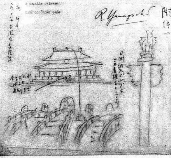 信中还附上了一张画:画着华表、金水桥、天安门城楼,一条抛物线指向天安门城楼。旁边用日文写着:从日本买来的消防压水机,能超过这个屋顶。