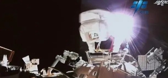 王亚平太空行走视频截图,很糊,但很历史。图源:@载人航天小喇叭