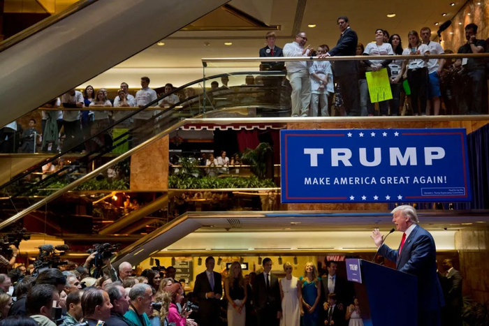 2015年6月16日,特朗普在纽约特朗普大厦,面对一小群支持者宣布角逐总统的决定。阿贝丁在书中写道,据说这一小部分支持者中有些人是因为发了钱才去当群众演员的。