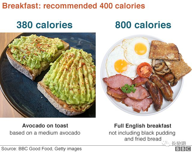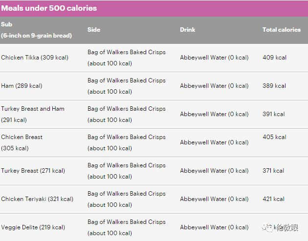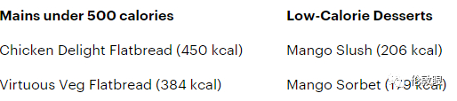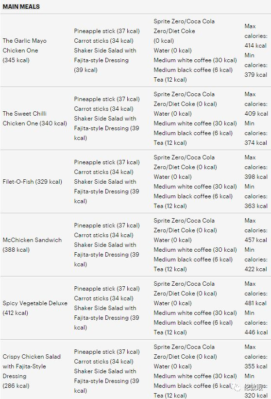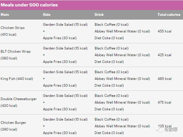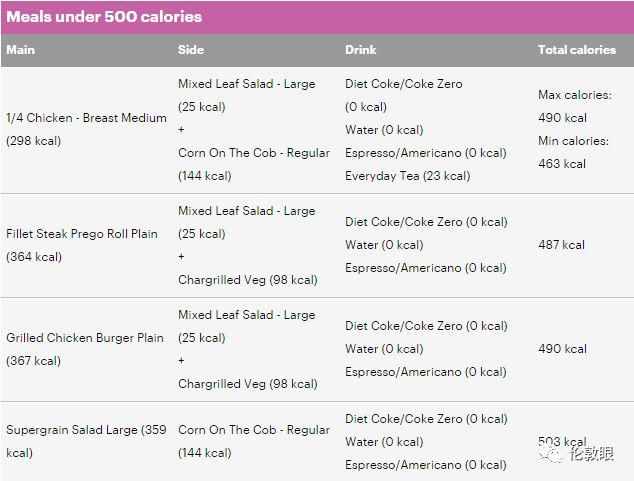 卡路里一览。每日邮报也是非常贴心的给出了配餐和饮料的选项呢!