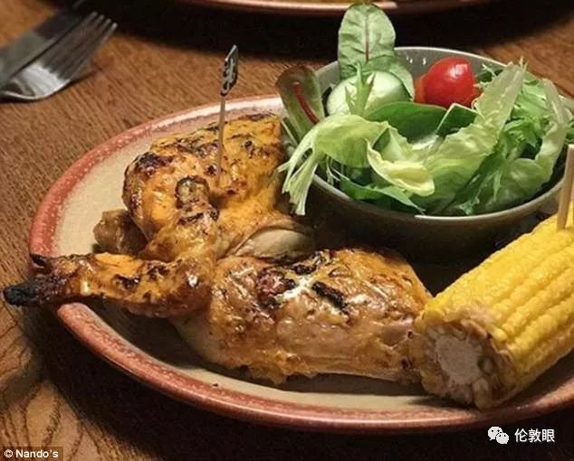 Nando’s:The quarter chicken + a Mixed Leaf Salad +a Corn on the Cob= 490卡路里