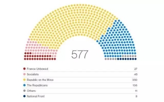 在2016年和2017年初的时候,很多人也认为在这一次的选举当中,可能会出现这样的局面。但是事实上我们看到马克龙不但赢得了总统选举,也赢得了议会选举,而且他赢得的代表席位是相当多的。我们看到在国民议会有577个席位,马克龙的“前进”获得了308席,他一个政党就获得了50%以上的绝对多数,跟他结盟的是民主运动党,获得了42席,这两个党构成了议会多数,他们获得了350席。