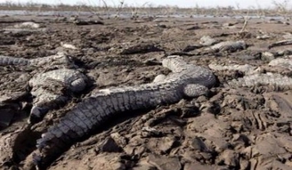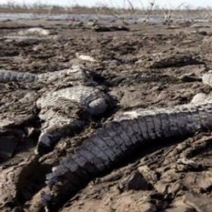 当地时间7月4日,巴拉圭皮科马约河的河水枯竭,鳄鱼为了生存扎进还没有被完全晒干的泥土里。