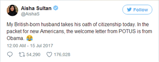 然而,一名叫艾莎·苏丹的美国网友却发现,她丈夫在7月14日收到的入籍贺信上,居然是前任总统奥巴马的签名!