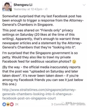 并怒怼新加坡政府:你们是否也会翻查我的私人推送,检查我有没有发些具有煽动性的照片啊?!