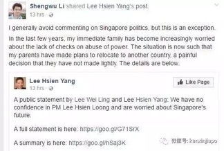 在前段时间的李家纷争中,大家应该不难发现李光耀的唯一女儿李玮玲,和弟弟李显扬的关系很好。果然,李绳武的这个Facebook一出,姑姑李玮玲在半小时后力挺;四分钟后,李显扬全文转发姐姐的推文,以实际行动声援儿子。