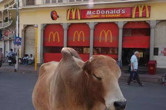 在印度去吃麦当劳,绝对吃不到牛肉的“巨无霸”,因为那里只有羊肉的。外国人要想吃牛肉,只能到穆斯林聚居的专门店铺去买,拿回家自己做。