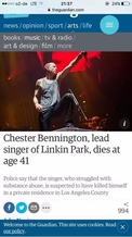 独立报:“林肯公园主唱查斯特·班宁顿自杀身亡,享年41岁。”
