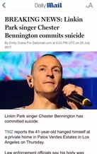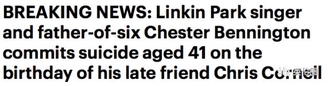 每日邮报:“林肯公园主唱,六岁孩子的爸爸查斯特·班宁顿在好友Chris Cornell诞生之日自杀身亡,享年41岁。”