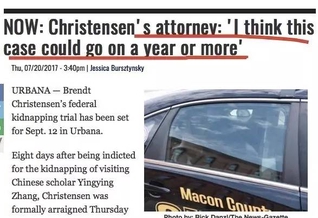 章莹颖失踪40多天了,尽管涉嫌绑架章莹颖的嫌犯克里斯滕森(Brendt Christensen)已经被逮捕并起诉,但是章莹颖仍是下落不明。