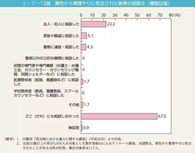 2014年内阁府对20岁以上的男女5000人进行问卷调查,调查显示,被迫与异性发生关系的人群当中,没有跟任何人商量过受害经历的女性占67.5%,找警察商量过的仅占4.3%。