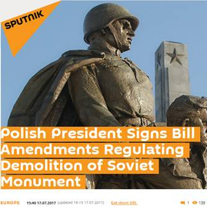 据俄罗斯卫星新闻通讯社报道,波兰总统安杰伊·杜达7月17日签署了禁止宣传共产主义法的修正案,规定拆除该国境内的苏联纪念碑。该法案将于签署3个月后生效,据波兰国家纪念研究所计算,这将涉及约230座红军纪念碑。