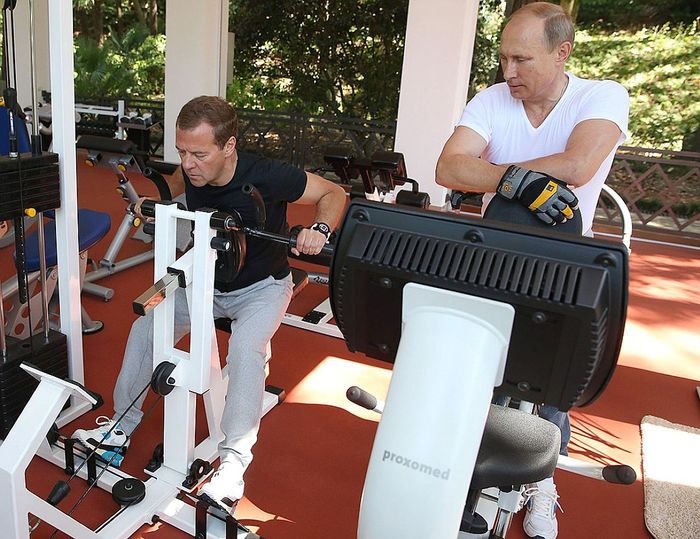 2015年,梅德韦杰夫和普京在索契的巴恰罗夫溪官邸锻炼身体。