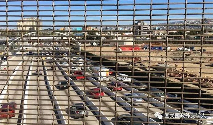 曾在1915年举办世博会的旅游胜城圣迭戈,地处美国加利福尼亚州最南端,与墨西哥下加利福尼亚州最大城市蒂华纳组成都会圈。从圣迭戈市中心,有一条轻轨直达边境,单程仅30分钟不到。轻轨终点站和区隔两国的边界栅栏只有几十米距离。一面巨大的墨西哥国旗,三倍于栅栏高度,竖立在空地上。蒂华纳市群山绵延,连同山坡上密密麻麻的房屋,在国旗背后展开一幅长卷。圣西多罗区是圣迭戈边境线上最大的出入境口岸。隔着人行天桥的粗铁丝网向下望,一队队车密集而缓慢地通行。从墨西哥进入美国的公路为三车道,宽度只有从美入墨六车道的一半。
