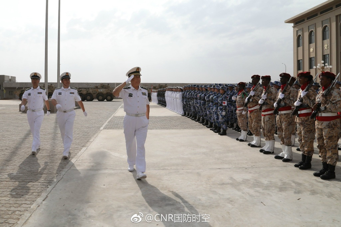 升旗仪式后,举行了阅兵式,乘海军舰艇刚刚抵达吉布提的基地部分官兵组成4个人员方队和1个装备方队,以及吉布提三军仪仗队,在营区广场整齐列队,接受检阅。