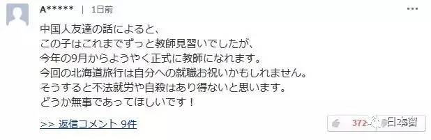 从中国朋友那里听说,她此前一直是实习教师,今年9月终于可以转为正式教师。这次的北海道旅行,很可能是为了庆祝就职成功。这样说来偷渡黑在日本或者自杀都解释不通。希望平安无事!