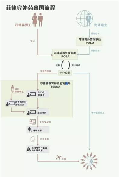 菲律宾劳工部在 30 多个国家设下的分支机构 POLO(Philippine Overseas Labor Offices菲律宾外劳办事处),像是蔓延至世界的信息终端,每日源源不断地收集着各地雇主的“订单”信息,通过审核之后,汇聚到菲律宾海外就业署(POEA);与此同时,有出国意愿的菲劳也可以向 POEA 登记个人信息。