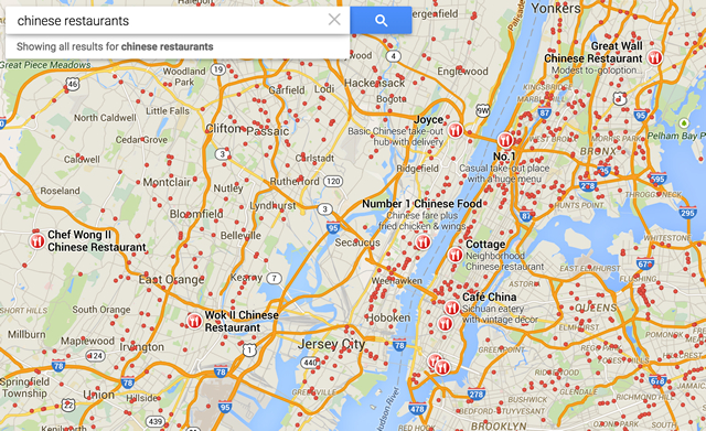 我在Google地图上用关键词 Chinese Restaurants 搜了一下,结果密密麻麻。
