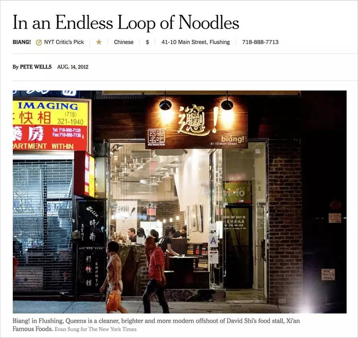 其中最著名的一家店叫西安名吃,Xi‘an Famous Food,是一个陕西移民开的。几年前刚开业不久,这家店就得到了《纽约时报》美食版的青睐,专门写了一篇食评——要知道登上《纽约时报》是多少餐厅一辈子梦寐以求却可望不可及的梦想。