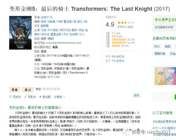 比如在中国拿下16亿,排总票房第11的《变形金刚5》,在豆瓣的评分是4.9分。