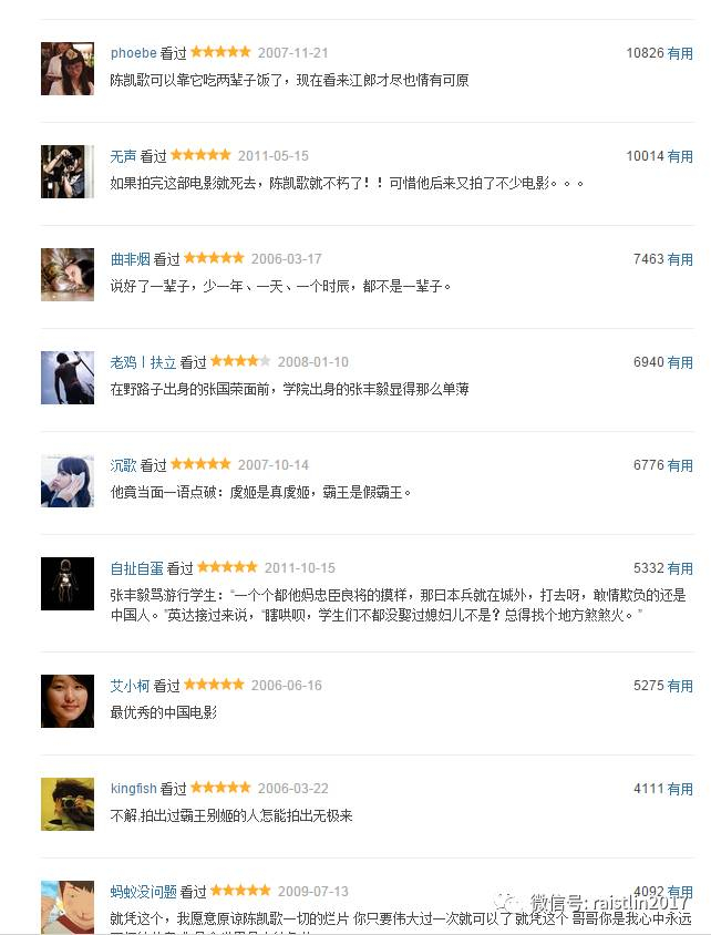 比如说这是豆瓣9.5分的《霸王别姬》下前十的热评,事实上你可以去翻一翻这部电影的评价,前两页能找出一个冷嘲热讽来算我输。
